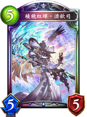 棱镜虹辉·济欧司能以不消耗费用的方式铺场。他召唤的迷雾巨龙站场能力强,特别是在面对造物仇、阿丽雅妖等依赖随从攻击解场的对手时;而神圣光明龙可以起到类似的作用,还能针对奥义皇等依靠疾驰随从取胜的组合技。如果能同时召唤出光明龙和自己,对手会非常难以处理。