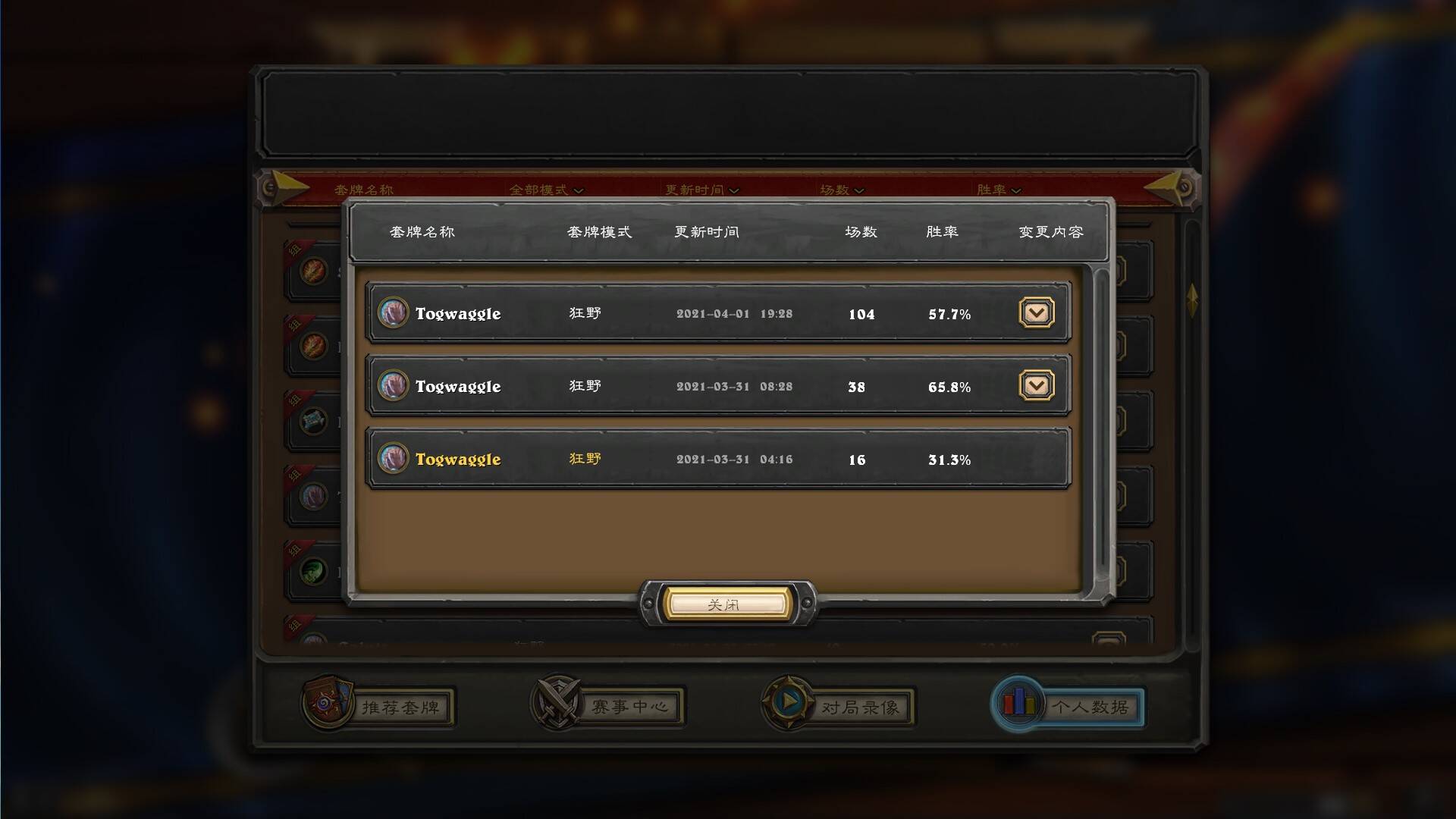 用官方插件统计,这套卡组从青铜倒传说总共158场的整体胜率是57.0%: