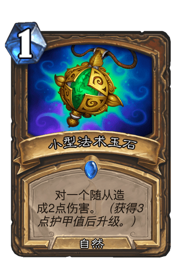 小型法术玉石获得升级的机会很多,在升级一次后就可以解掉南海船长、暴乱狂战士、布莱恩·铜须、前沿哨所、螃蟹骑士等威胁较大的随从,升级两次后就可以用来对付暗金教水晶侍女和索瑞森大帝了,也可以在一费的时候不升级解掉奇数瞎的两血小怪。而愤怒虽然可以过牌,但处理不了四血以上的随从,费用还更高,不如小型法术玉石。