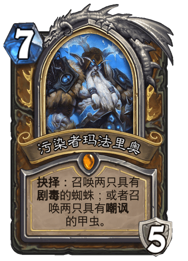 - 厕所骑:优势,注意留好传播瘟疫,三费的时候手上有传播瘟疫可以直接打生物计划,免得对方打出战斗号角之后我们费用不够,前沿哨所和尼鲁巴蛛网领主对我们影响不大,但螃蟹骑士一定要解。