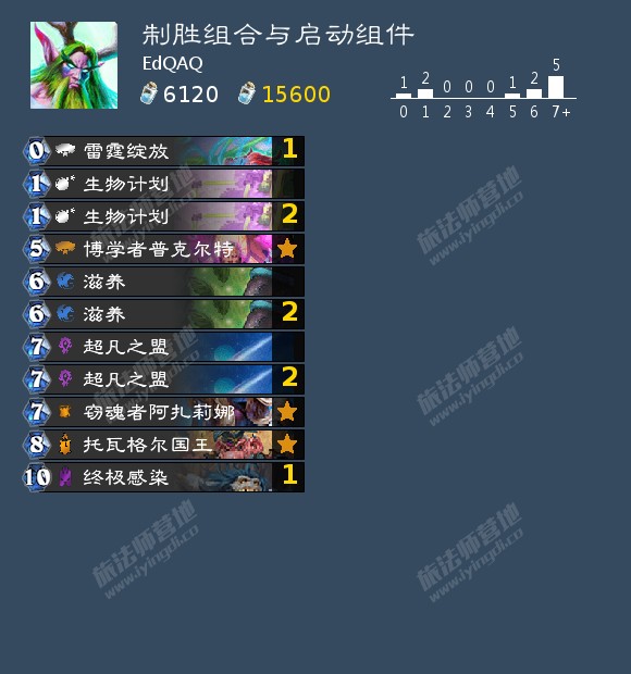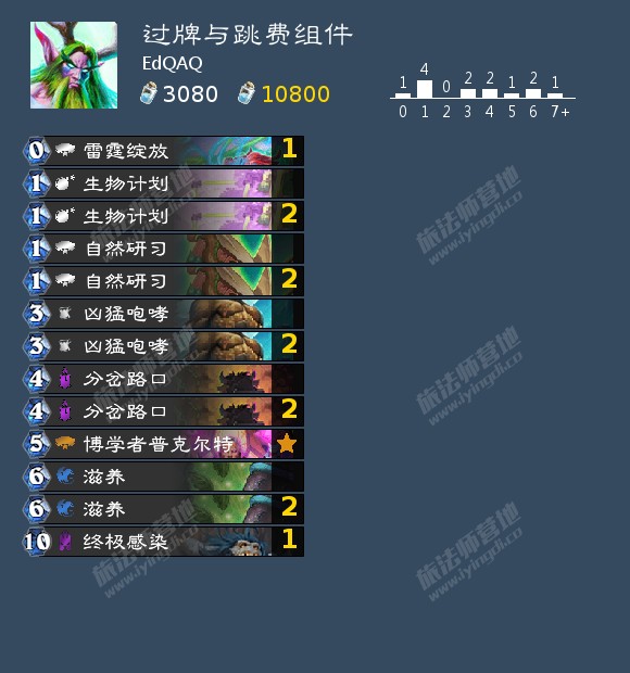 雷霆绽放是比较弱的,经常会卡自己下回合的节奏,被大法师瓦格斯打出更是血亏,实际体验还不如激活/自然研习,但打出超凡之盟后,雷霆绽放和激活都会变成一费,这时候激活就完全没有作用了,所以选择带一张雷霆绽放。生物计划不仅可以在打出超凡之盟后作为制胜组合使用,也可以在前期帮助我们快速过渡到能打出传播瘟疫的回合,所以满编。