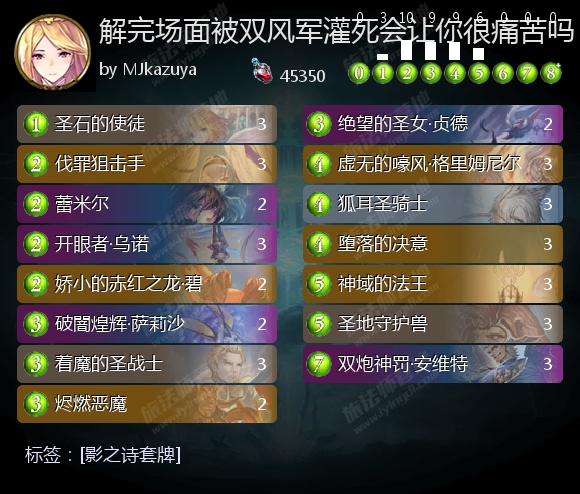 对脸皇:73开。守护教一直是快攻的天敌,无穷尽的嘲讽对于抢血是一道天堑。前期不要吝啬场面交换,准时进化的伐罪和烬燃恶魔很容易打碎对面的心态。进化回合注意暴虐武人·杰诺的白嫖进化随从功能,不要只给自己留一堵进化后的墙。后期要注意雷灭卿·阿尔贝尔的斩杀,八费时尽可能清理对手场面。