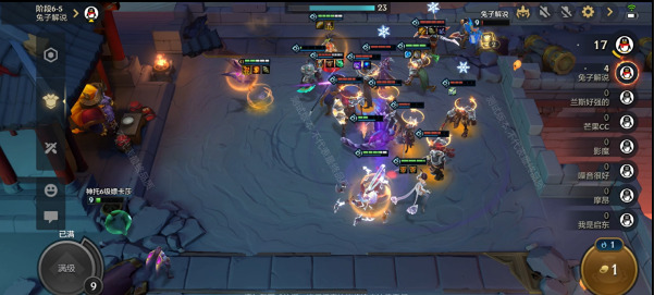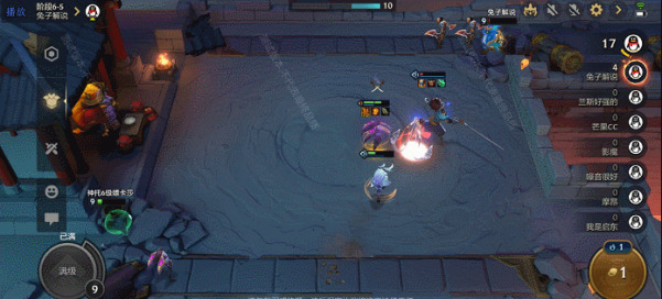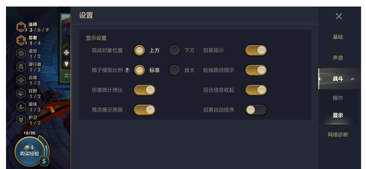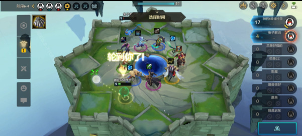 对战界面的左上角是游戏阶段信息,可以查看过去战胜或战败的对手信息,这个阶段栏是可以隐藏的。靠左依次是羁绊信息,装备库,投掷互动道具,亮表情(注入灵魂)和聊天窗口。右上角的几个小图标分别是推荐阵容,声音开关,麦克风开关,设置,手机网络和电量信息。