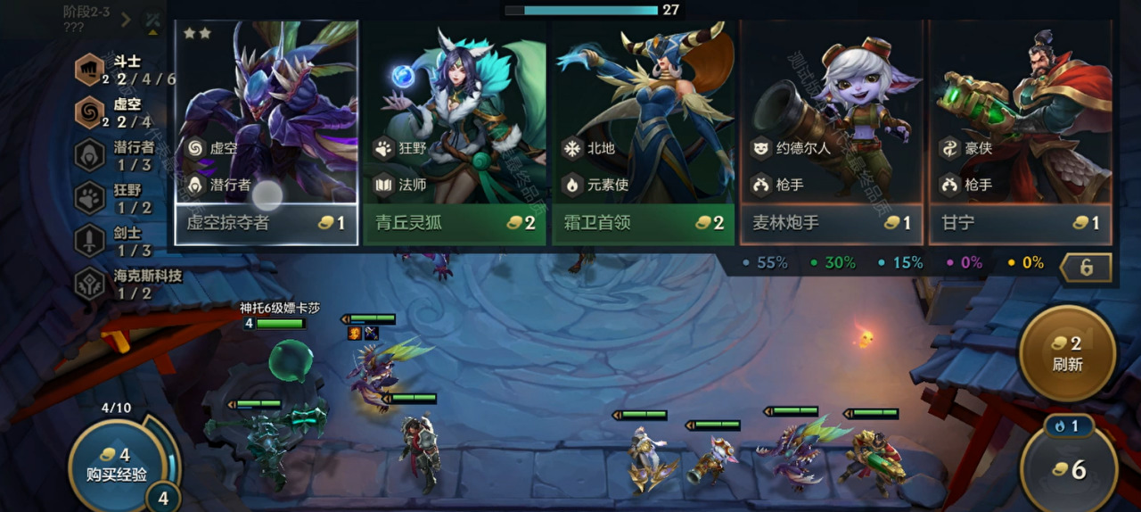 6阶段对手已经颇具强度,神托做了一个冒险的决定,将差一只就3星的螳螂卖掉换成1星卡莎。