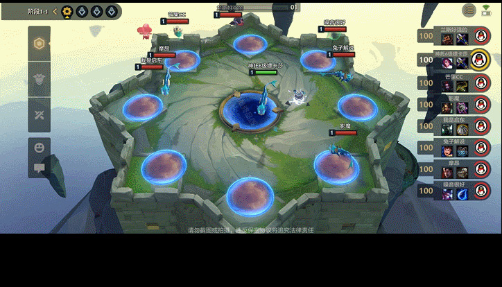 如图中紫队的和蓝队血量最低的队友为0,率先选秀。神托所在的绿队的队友血量为14,低于橙队的29,所以我沾光一起出来选秀啦~