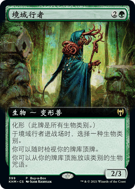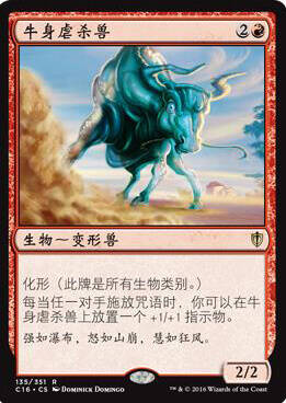 在三费曲线上,我们继续贯彻套牌的构筑思路,加入了更多的“熊”。璃池拟态妖不仅有着变形兽类别,还可以解决你的法术力问题;镜身灵给了我们另一种膨胀生物的手段,同时让百熊女王阿育拉吃到利雅拉诸熊录的增益(镜身灵的异能使我们操控的生物获得所有生物类别);境域行者(进场时选择熊)允许我们施放牌库顶的任意生物咒语,帮助我们在与慢速套牌的对局中赚取卡差优势;牛身虐杀兽会随着对手施放咒语不断变大,迫使对手尽早对它作出回应(实际上它很难成为这套牌的终结手段,许多时候都是进场吃闪电击)。