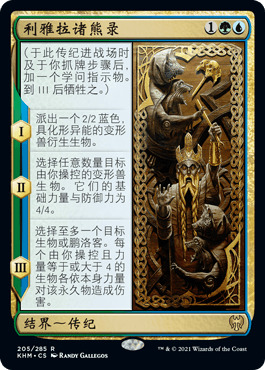 利雅拉诸熊录真正强力的地方是它的第二阶段,能让所有变形兽拥有4/4的基础身材。理论上讲,我们可以在前几个回合用低费变形兽铺场,然后结算利雅拉诸熊录,凭借场上的变形兽大军在下个回合击败对手。传纪的第三阶段在这套牌里起到去除的作用,鉴于我们没有多余的卡位携带去除咒语,这个效应还是很不错的。