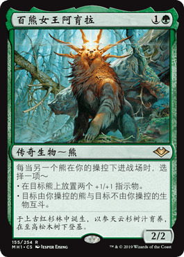 这套牌剩下的生物是各类“熊”。一费曲线上的小熊崽们尤为重要,它们和利雅拉诸熊录/百熊女王阿育拉都有着不错的配合。如果能在前三回合拍下三个一费变形兽然后结算利雅拉诸熊录(来得到第四个变形兽),我们在第四回合就拥有了高达16点的场攻,这样的场面在许多时候都足够你轻松取胜。百熊女王阿育拉会把我们的一费1/1膨胀成一费3/3,进一步加速对局的进程。一费曲线上可供选择的生物有很多,其中化形黜人和蛾粉化形最合我心意:两者都自带穿透效应,配合阿育拉或利雅拉诸熊录都能轻松打出大量直伤。