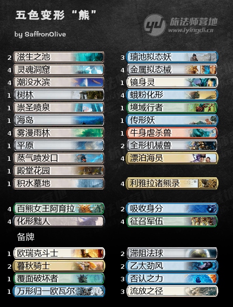 为了最大化利雅拉诸熊录的价值,我决定组一套满是变形兽的套牌,但问题也随之而来:利雅拉诸熊录作为回报手段并不能支撑起整套牌的运作,大部分变形兽的身材也远非优秀。我考虑了许多单卡,最终确定了套牌的第二核心——百熊女王阿育拉(在强度和风味上都完美契合我们的构筑思路),组出了这套五色变形“熊”。