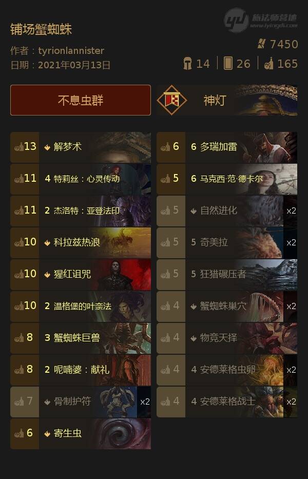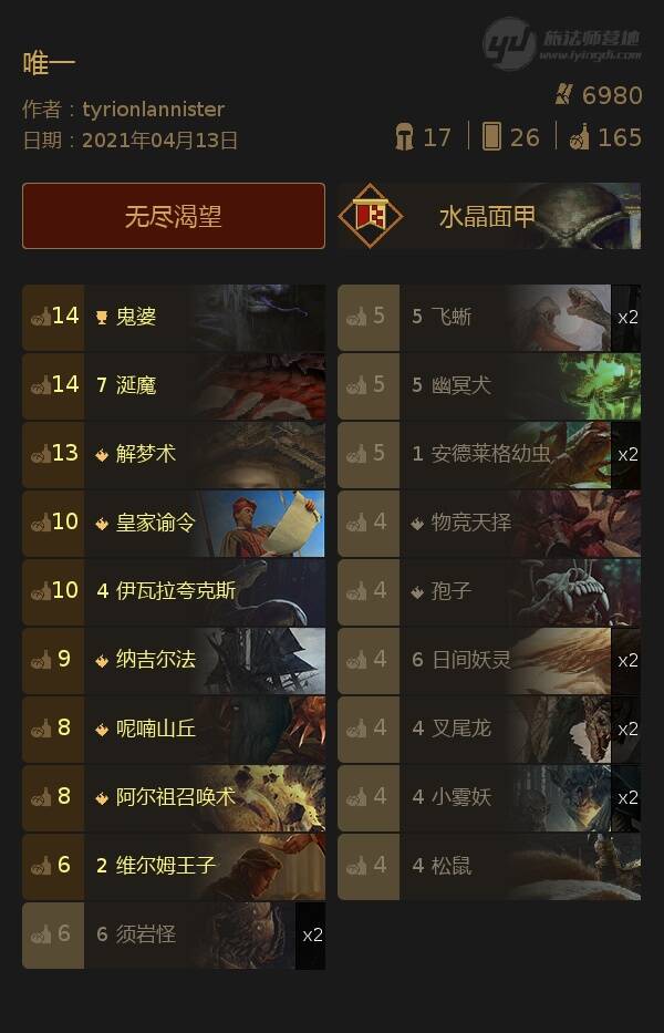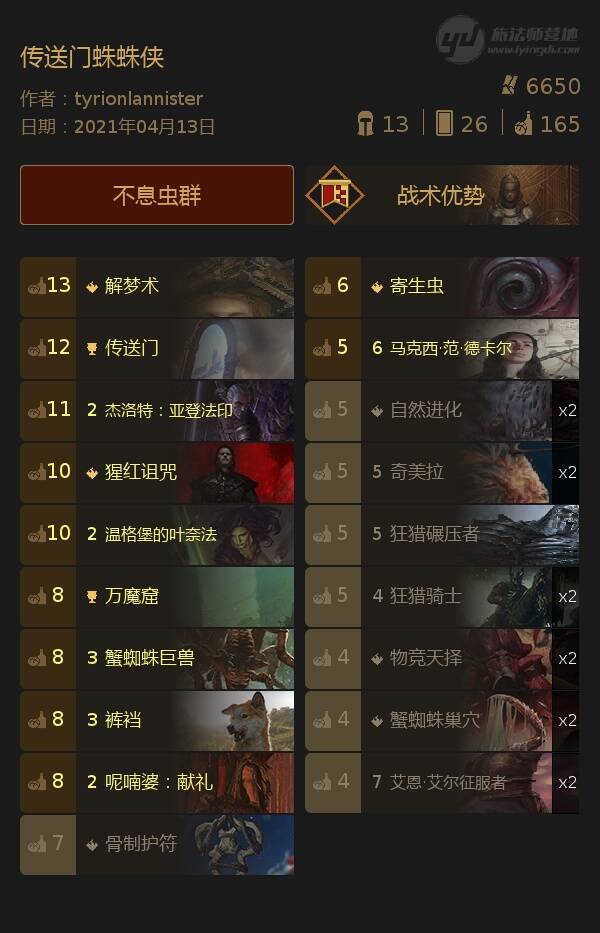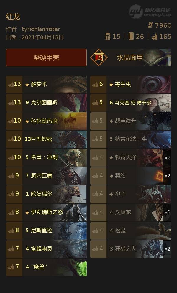 再说红龙,如果r1能抽到解梦术、卫士、希里:冲刺3张的其中2张,红龙甚至可以说是t1卡组,现在带去除的卡组不在少数,但能在r1摸到可就不是那么简单的事了,而且需要处理的引擎也不仅仅只是ciri、红龙,同时红龙卡组基本都是携带两张4p叉尾龙,在打蟹蜘蛛时有一定的优势。