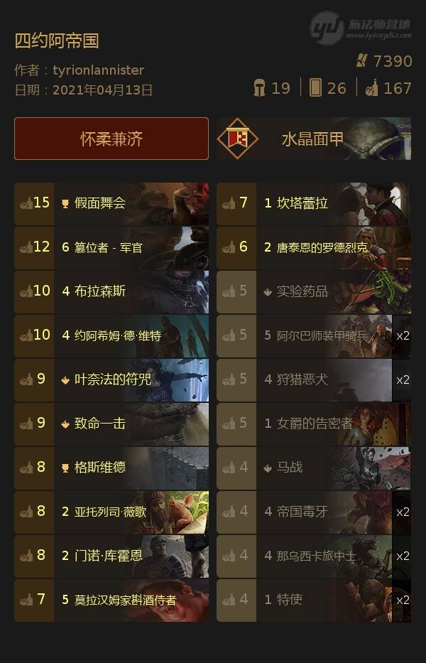 卡组的理想情况是在R1或者R2开出两次约阿,用于赢下R1或者抗逼牌;其它金卡资源除了剧情、篡位者、罗德烈克不适合在R1开之外,其它都可以酌情交出。
