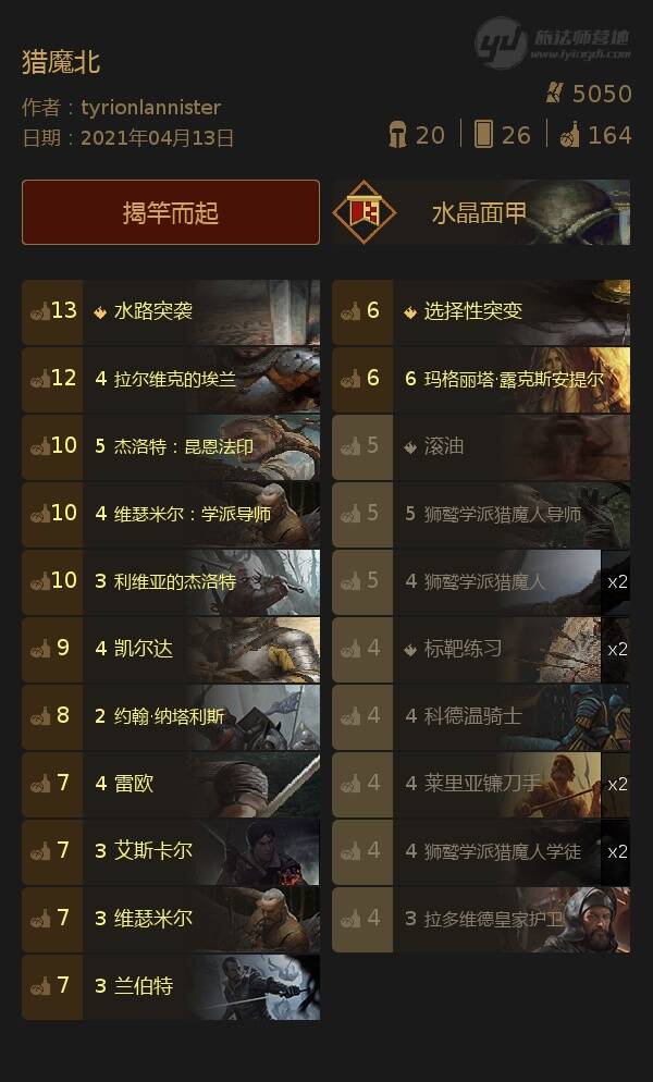 猎魔北在R2或者R3的5-6卡局的点数几乎无出其右,所以也是一套抢R1,莽R2,视情况找机会pass或者直接莽穿的卡组。卡组R1按部就班地拍引擎,在尽量赢下R1的前提下尽量省下水陆;R2是最考验这卡组操作技术的时候,尝试阅读对面的手牌并判断莽穿的可行性有多大是精通这套卡组的关键。
