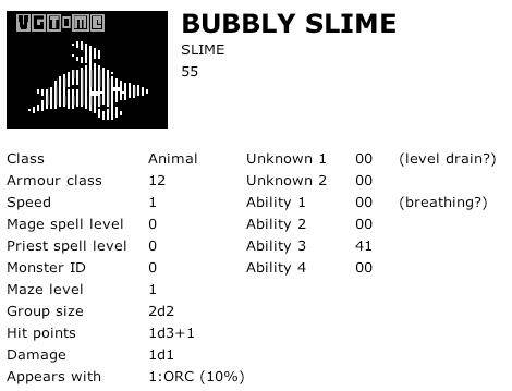 在《巫术》中,使用了“Bubbly Slime”的名称,同样也是作为游戏中初级小怪,给冒险者提供练手的经验。《巫术》的首作时间是1981年9月,作为一款迷宫探索游戏,在电子游戏历史上是里程碑一般的作品。但此类欧美游戏在设定上很难不受到RPG的鼻祖《龙与地下城》的影响。作为世界上第一个商业化的桌上角色扮演游戏,《龙与地下城》在1974年由加里·吉盖克斯与友人大卫·亚耐森在美国威斯康星州共同创造。其中加里·吉盖克斯在创作怪物图鉴的时候,创作了一类生活在地下城中的不定型生物,作为生物链中的分解者兢兢业业的清理着死在地城中各类生物的尸体。而这大概就是游戏中“史莱姆”最初的原型。当然要是继续深追《疯狂山脉》里的“修格斯”大概也能算成史莱姆的原型之一。