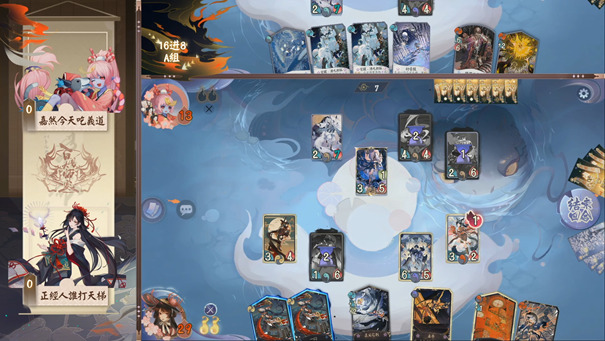 第一个瞬间,开局第三回合,对手在失去了鬼童丸的情况下只能选择出出击4血的清姬压场。刚好给了冰酒打出追风+无染+正义必胜组合的机会。这里我们计算一下无染的伤害,再有3名苍叶式神的情况下+3攻击,再使用过追风后再+1,到达7攻的无染配合鸦天狗的投射与伤害,一波打出14点伤害,在1勾时就降对手的血量压到半血以下,可见净琉璃叠加过伤害之后的威力。
