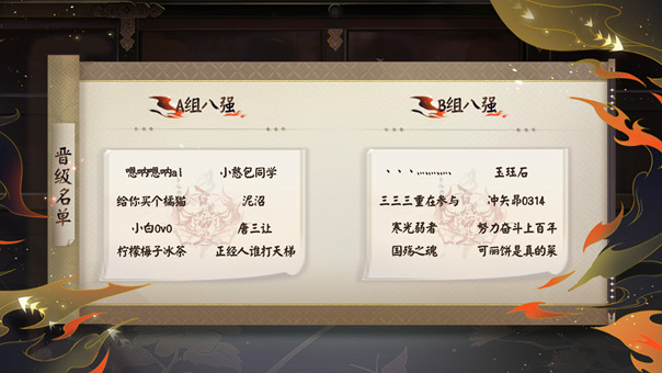 B组:丶丶丶灬灬灬、玉珏石、三三三重在参与、冲矢昴0314、寒光弱者、努力奋斗上百年、国殇之魂、可丽饼是真的菜