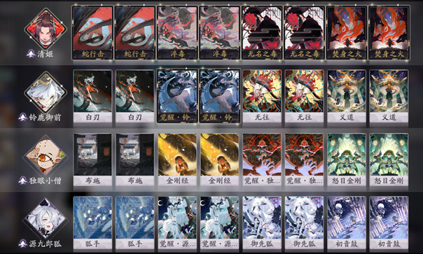 这是一套通过清铃为利剑,充分发挥源九郎狐在紫岩体系中提供属性增益以及破甲的效果的卡组。关键卡牌觉醒.源九郎狐,为全体紫岩式神增加属性增益的光环,对可以打出暴击伤害的铃鹿御前输出能力提升显著。同时初音鼓复活后的增益效果,更进一步强加了铃鹿御前的威胁。御先狐形态血量高适合站场,打出的破甲效果也为清姬解场提供了便利条件,而且可以触发铃鹿御前白刃的瞬发效果,也可以作为整个卡组爆发的起点。独眼小僧的加入,弥补了卡组在内战时的短板,由金刚经形态守护的己方牌手不在畏惧对手的贯通伤害,在游戏后期怒目金刚也可能成为压垮对手的最后一根稻草。