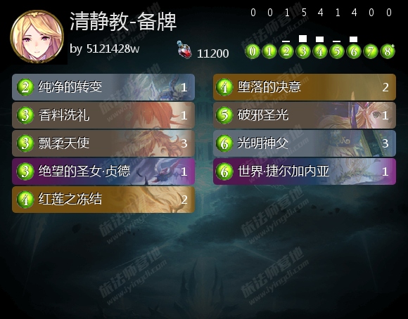 如你所见,这套卡组的构筑名是“参赛用”。它是我为了snc春季海选赛准备的特殊构筑,它圆满的完成了它的预定目标——关对手的载具龙和进化鬼。(但我带的另一套牌组拖了我的后腿)因此,它在天梯上的表现显得不尽如人意。缺少提前埋下的祭坛,清净在中期的动作就显得乏力。狐耳教父的本体也更难下场。祭坛是清净中期爆发的重要支点,缺少祭坛,中期的爆发代价就会变的非常大,因此,此构筑对于蛾子雪宝妖的抗性非常低。不过,在进化鬼数量与日俱增的情况下,这个构筑大家也可进行尝试。