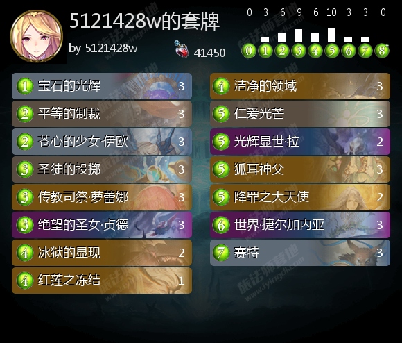 仁爱光芒:治疗+群体去除。在有清净在场时能够扫清大多数的中期场面,不亏牌。后期爆能使用时,清场能力/恢复能力进一步提升,赚一张牌。同时不会在自己的场上留下生物。(打增幅法时较为关键)满3。