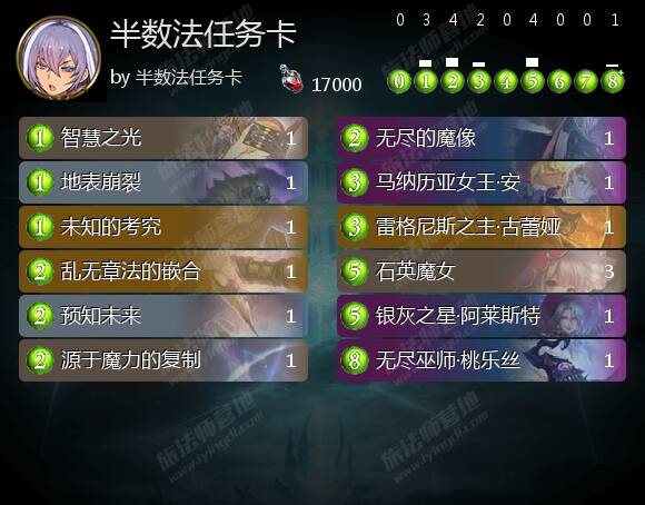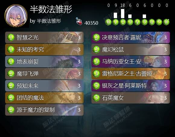投入了魔导飞弹和决意预言者·露妮 ,让卡组拥有了更多的直伤能力,纯半数法只有安的进化特效可以打2,飞弹打1和7次增幅露妮打3提供的直伤让我们不会过于依赖愚者,魔幻松鼠、露妮、石英魔女即可以起到站场作用,不管是解场还是抢血都更为优秀;也赋予了这套卡组强大的过牌能力,配合安、古雷亚、银灰之星等半数组件可以达到快速抽空牌库的目的。