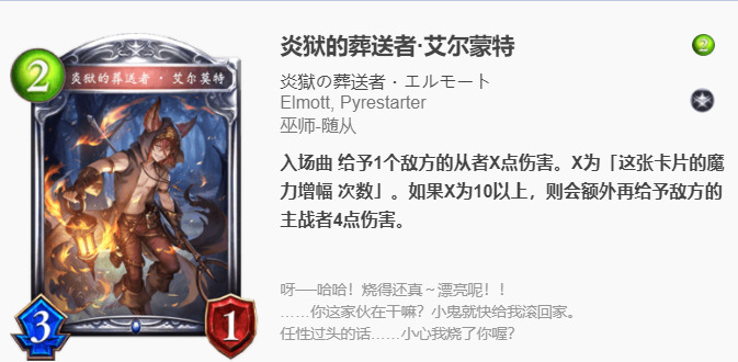 作为一张随从牌2费抽一增幅一次,与卡组中的增幅组件配合良好,并提供站场。