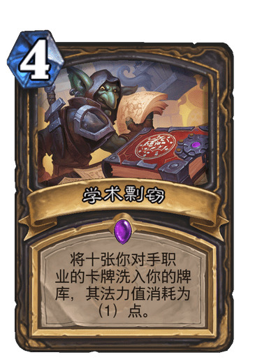 学术剽窃(选带牌):前期除非已经打出银叶草药膏并且手上有抽刀,保证不会断刀,否则不要打出学术剽窃。通常在牌库快空时再打出学术剽窃最佳。弑君贼如果不卡手,经常在8-9费就能过空牌库,然后学术剽窃就能发挥巨大作用。
