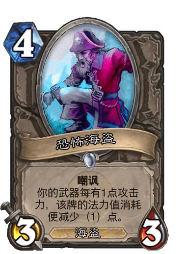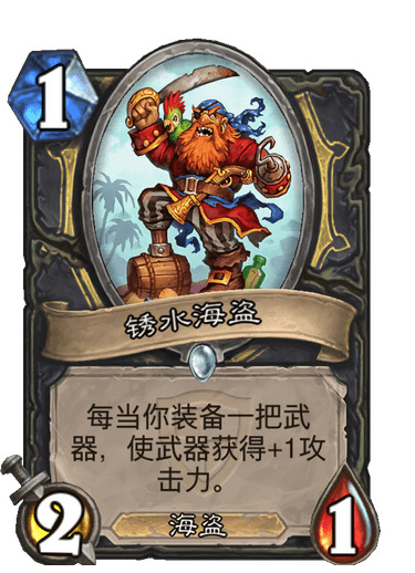 锈水海盗:锈水海盗在海军贼中是非常重要的牌,因为可以拉出帕奇斯,即使起手没有刀也会留。而对于弑君贼就不一样了,这只是一张很普通的buff牌而已,如果不是为了配合团伙劫掠,甚至不会带他,所以只有在起手有刀时会考虑留。再者就是需要灵活应变,弑君不需要在第一次挂时就吃到锈水海盗的buff。比如2费时我们有两张锈水海盗,又需要弑君解场,那么应该考虑直接打出一张锈水海盗挂弑君。另一张锈水海盗等到第二次挂弑君时再出也可。甚至有时当做1费2/1白板出也是可以的。