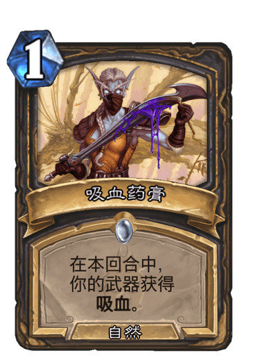 吸血药膏:弑君贼的精华所在,也是对阵抢脸卡组的核心牌。等到中期刀的攻击力较高时,配合末日回旋镖使用,效果最好。尽量不要前期只回个几血这样无济于事。对阵慢速卡组时,只要下回合不可能死,就不要急着打出吸血药膏去回血,这可以干扰对方的判断。由于信息差,对方不会猜到我们有吸血药膏,就可能会想抢死我们。比如全力下怪,甚至提前拍雷诺站场之类,这很常见。另外吸血药膏配合剑刃乱舞不能回血。