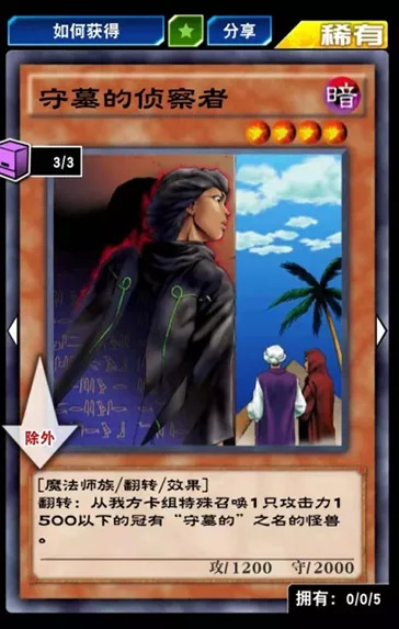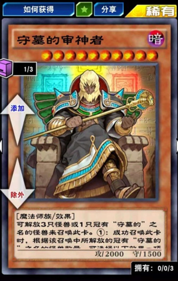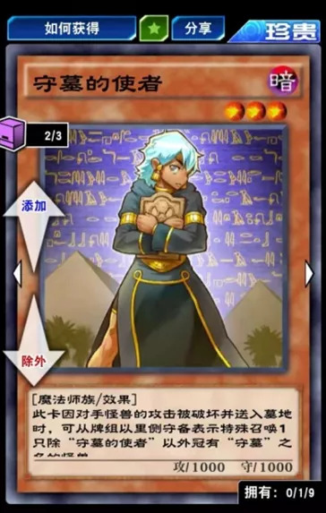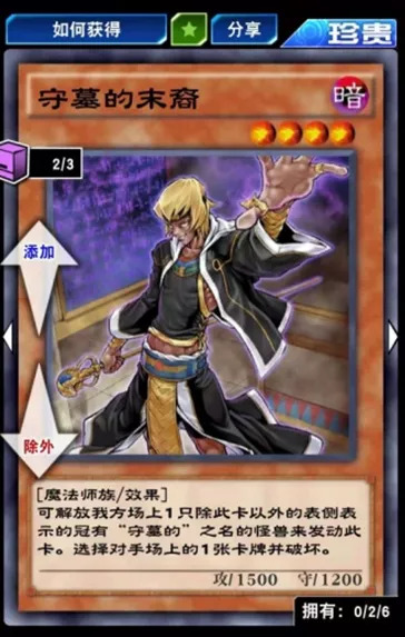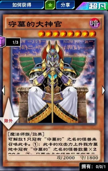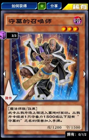 守墓的审神者黑商处换取的曾经守墓大哥(据传闻是末裔和神官的中年形态反正我是听说的)。获取方式简单容易,虽然他没有那么高的抗性,但是他登场的效果也是守墓很强力的存在,正常在对局时候会使用它的降攻守效果(弹出是否加攻击力是否炸里侧怪兽点否就会触发其他效果)可以在一定条件下达成对0攻场的OTK对局自闭也是有一定的强度。但是本身还是上级卡手,而且可以被召唤师检索。建议下1如果没大神官可以下2。