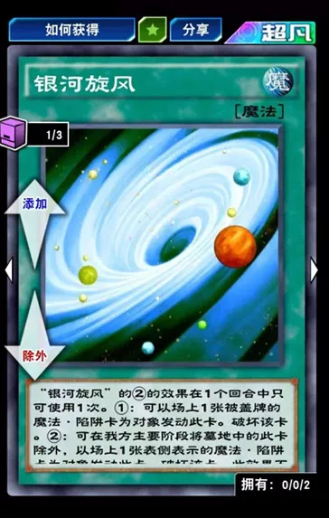 银河旋风卡包UR,这张卡不用多说,就是吹后场的当前国服神卡,而且在墓地的下个回合可以用来炸一次表侧的魔陷,比如机甲的装备、支付2000血的镜子、65的聚集。总之这张卡让一些坑慢慢的开始进行退出舞台倒计时了,无论什么卡组(后面出帝王的话除外)都需要下1-2的。