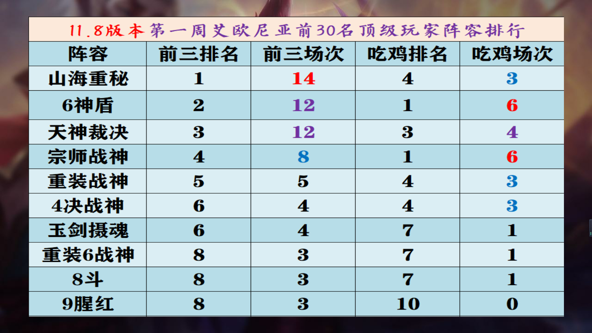 本周外服阵容吃分前三强:宗师战神、9腥红、决斗宗师;