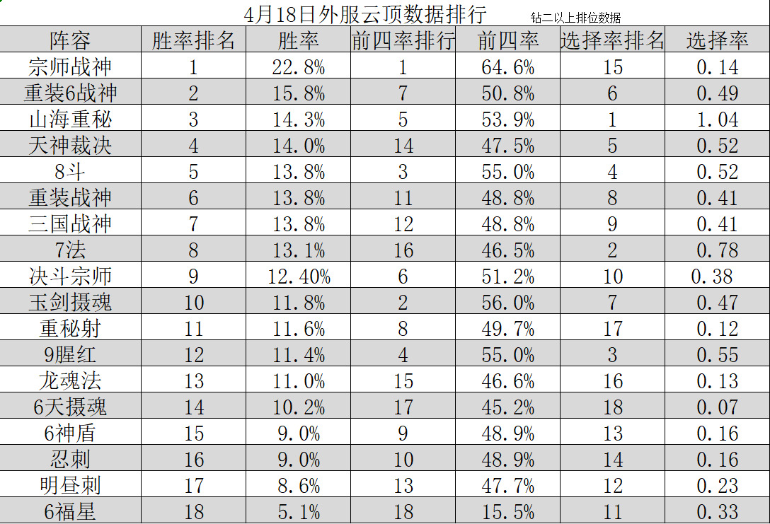 这周外服与国服阵容环境差距还是较大,在选择阵容率上均是山海重秘一家独大,但吃鸡率与吃分率上国服以山海重秘、重装战神、神盾凯南为主而外服却是以宗师战神、龙魂法6战神为主。