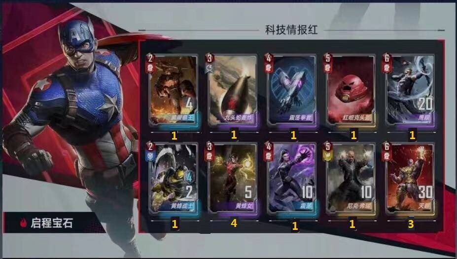 (2)第二种是本文介绍的这种【科技情报红】,三英雄用黑寡妇、海拉、还有科技之王——钢铁侠,这种打法比较飘逸,以科技力量为主,辅助以红队的攻击。完全跳出了其他类型三本红队的思路,胜率也不低于其他红队。