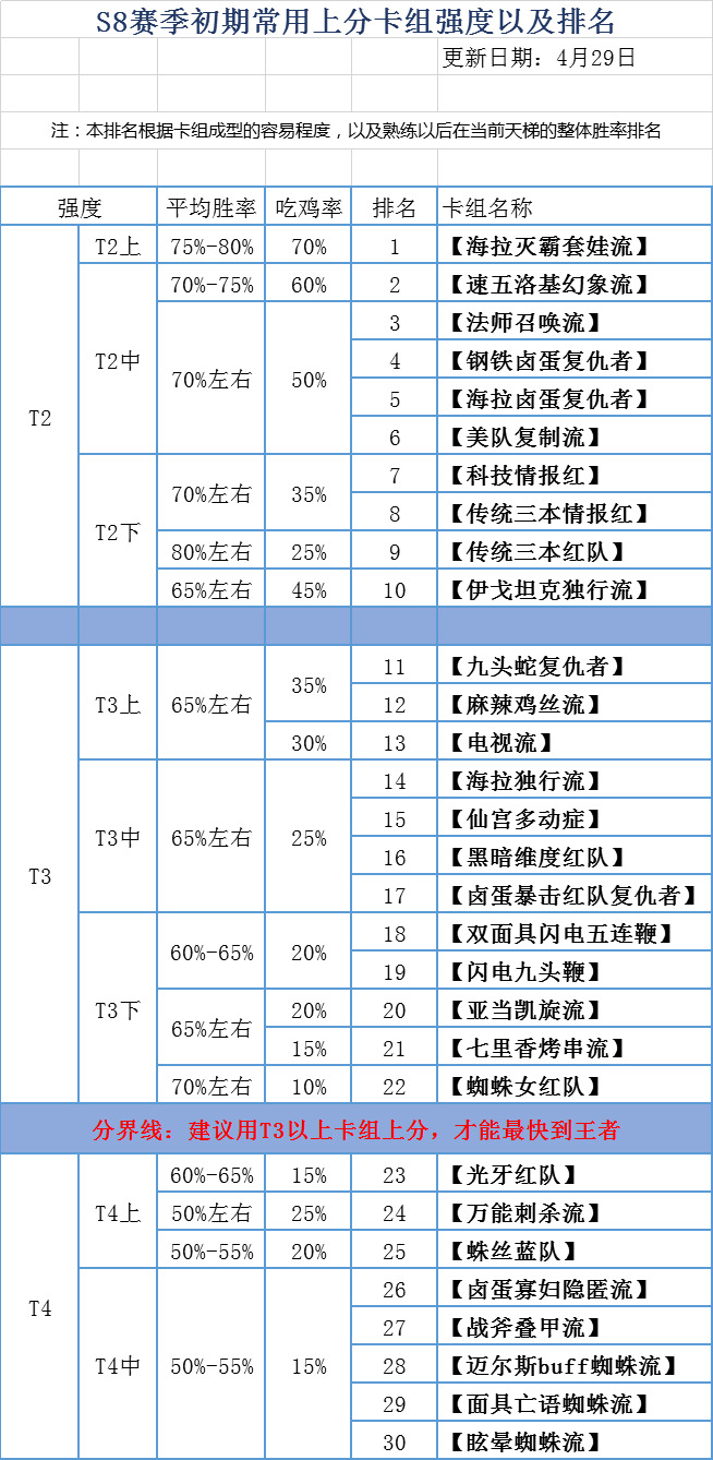 S8赛季的预告已经出来了,教团被大幅度削弱,惊队大幅度改动,但是现在还没有稳定的流派,本文先列出本赛季的上分卡组排名,方便冲分的玩家参考。