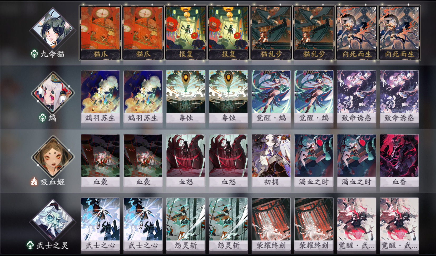 猫乱步:主要用于解比较棘手的后排,如神赐良缘,轮回之面,源九郎狐和火取魔等,手中有猫乱步时,要注意九命猫的命数使用。