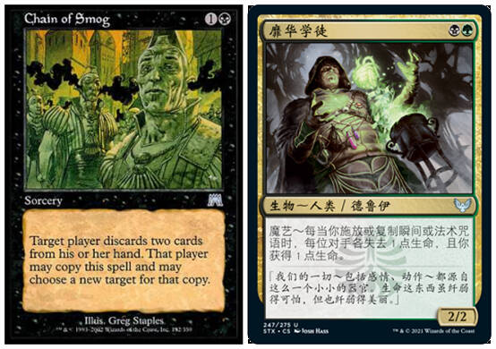 新系列斯翠海文给薪传环境带了一套全新的两卡组合技——靡华学徒+连锁烟雾。组合技的运作方式是:先有一个靡华学徒在场,施放连锁烟雾指定自己,这会触发靡华学徒的异能,然后选择复制连锁烟雾,再次触发靡华学徒的异能,重复此过程直到靡华学徒的异能将对手生命终结