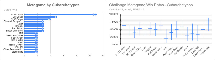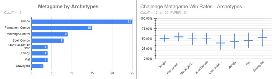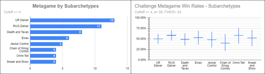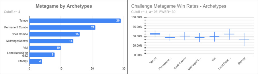 Tempo(节奏)类套牌占了大头,其中有近一半的铁木尔掘密师,并且具有非常高的胜率。确实令人惊讶,但又在情理之中,控制套牌失去了星盘与瓯柯后再也难以对掘密师套牌造成太大威胁。数量排在后面的是红蓝掘密师与苏勒台掘密师,其中大部分苏勒台掘密师是使用连锁烟雾组合技的版本。下面是八强套牌