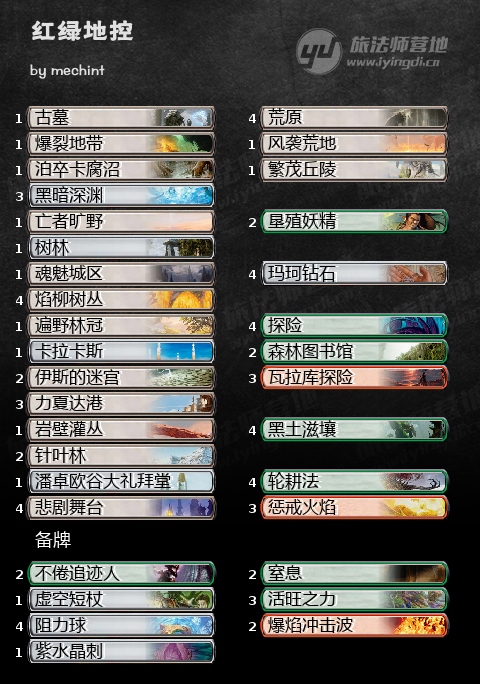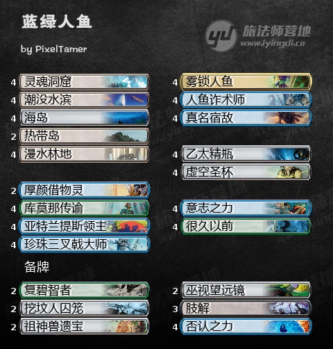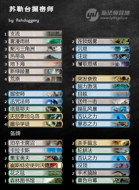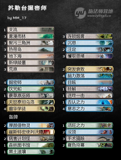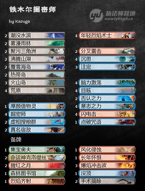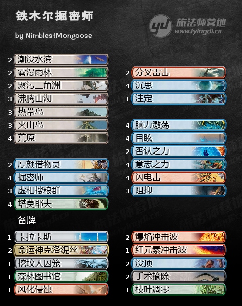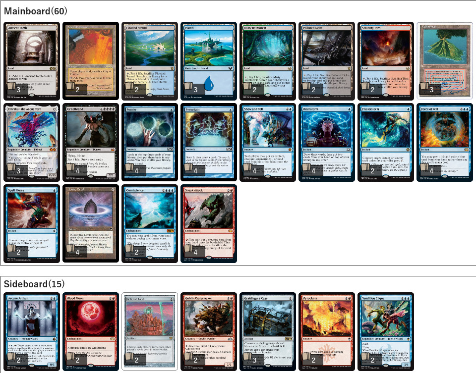 最终是由一套铁木尔掘密师(备牌混绿的红蓝掘密师)席卷。主牌是非常传统的红蓝掘密师,在备牌混绿使用了命运神克洛缇丝、森林图书馆、集宝奥夫。这似乎是目前最好的套牌,既有强大且主动的主牌游戏计划,又有非常可靠的备牌针对