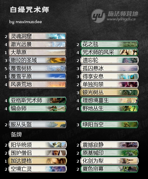 第一场挑战赛里一套神奇的白绿咒术师吸引了我,服从头盔+得享安息的组合技非常适合作为这套牌的致胜手段。编命师不仅让结界咒语无法被反击,还能作为第二种致胜手段,非常强大的补充