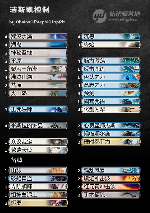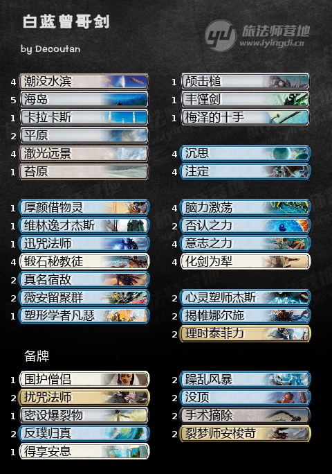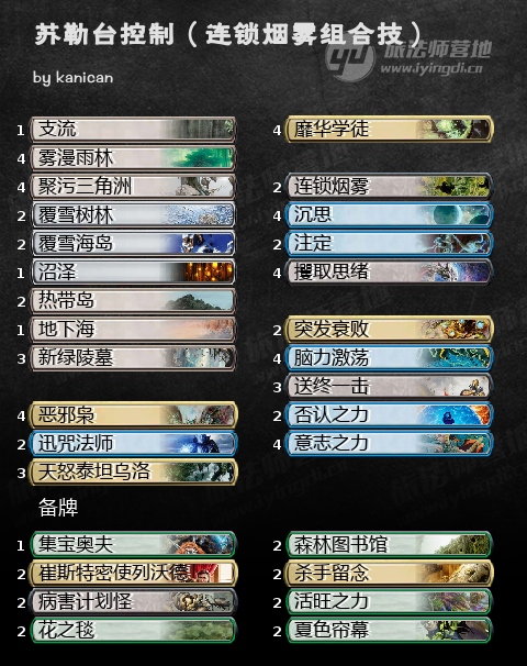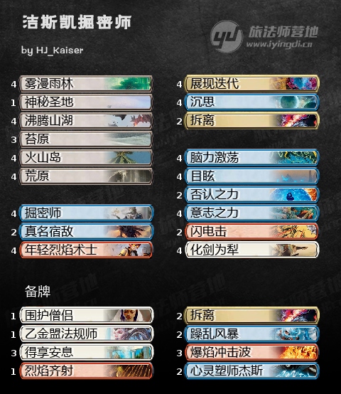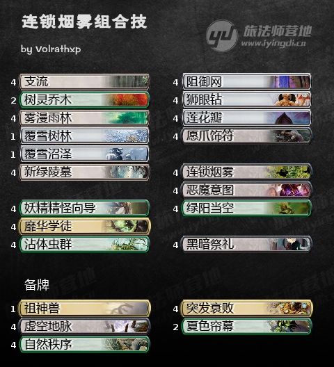 四强还有一套苏勒台掘密师,使用了连锁烟雾组合技。主牌的躁乱风暴非常合理,也能多次触发靡华学徒的魔艺,并可以用来保护组合技的运作。比如启动组合技后,可以先出一个迅咒法师指定坟里的躁乱风暴,如果对手要打断组合技,则可以返照躁乱风暴反击对手的咒语,同时触发多次靡华学徒的魔艺造成一些伤害