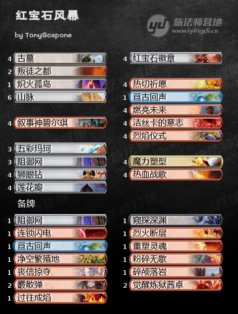 一套红宝石风暴(Ruby Storm)打进了八强!近期的系列陆陆续续给这套牌添加了许多强牌,比如叙事神碧尔琪、洁丝卡的意志、燃亮未来。套牌的发明者即这次打进八强的 TonyScapone,恭喜!