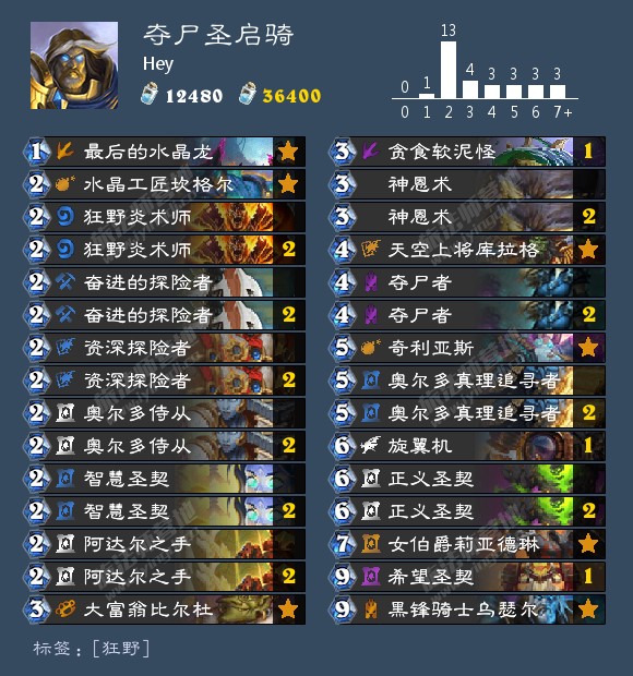 宇宙牧:从战绩看是小优对局可能赢一手信息差吧,客观来看属于均势对局,宇宙牧也有一点组合技的味道,不过因为其优秀的aoe和苟活能力我还是把他放到控制卡组里讲,留牌方面dk可以起手留大富翁比尔杜我基本上看其他牌顺的话也会留,所有过牌都留,因为有信息差对面不太清楚我们的形态,基本上默认我们是污手骑,不会刻意留破坏otk组件的卡,有时候我一费打张水晶学/一费下圣礼骑士对面直接下脏鼠,前期可以当buff骑打给压力,注意姐夫找杀手蟹吃风怒鱼,宇宙牧很难偷死除非对面牌序不好,最后基本上是靠otk四骑士斩杀的,也有靠场面压死的时候这时候要看双方资源规划能力了,裂心者不需要防也没必要防,而且宇宙牧过牌慢不会把把裂心者的而且打快攻基本上也不留裂心者,被裂心者也不一定输我有几把都是被换牌之后取胜的。