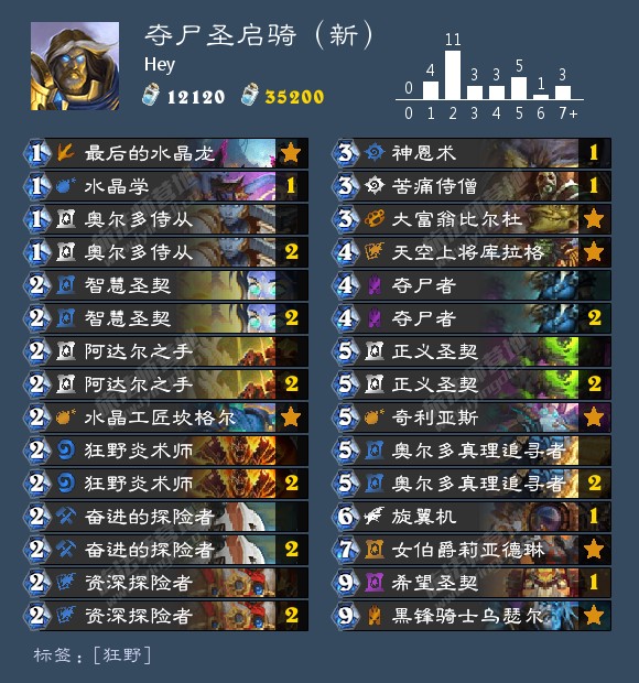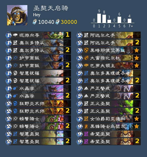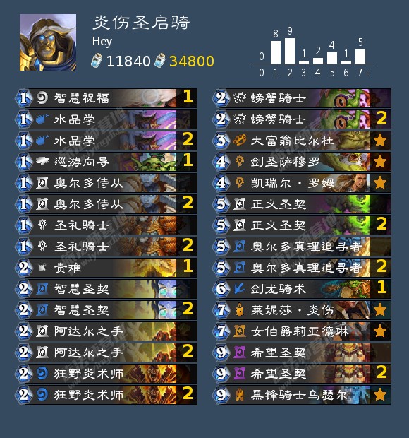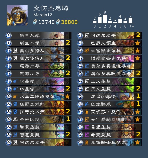 大家好我是Margin12,一位喜欢用冷门卡组上分的养生玩家,战网id:Hey#52525,这是我第三次写圣契天启骑的攻略,每个版本我都在研究圣契天启骑,外域版本:夺尸圣启骑(吸尘骑),通灵学院:炎伤圣启骑,暗月竞速赛:圣契天启骑,刚写完初稿终于有时间了,距离第一次写已经过了一整年,在我下定决心玩圣契天启骑之前我还是一个骑士小白,玩过死鱼骑、奇数骑、偶数骑、号角骑快攻骑,但是玩的场次并不多,后来在精进这套卡组的过程中技术不断进步对于这套卡组的理解也不断加深,多余的尘也用来镀金这套卡组,因为一是觉得这个套路非常有趣我也是最早开发这套卡组的那批人有一定情怀了,二是这套卡组对狂野的大部分卡组都有一战之力能够成为狂野圣骑士的常青藤卡组,还有就是这套卡组玩的人很少(不太喜欢打内战),符合我喜欢用冷门卡组上分的特点!!所以最终我做了一套全金圣契天启骑,这个月我全程用这套卡组从青铜小鸡打到前二百,胜率大概在68%左右(随身炉石传说上面是总胜率包含之前玩的胜率所以低一些66%),这套圣契天启骑很全面对大部分卡组都有一战之力,很有操作感强度也不错(注:卡组难度偏高,说是圣骑士狂野难度最高的卡组也不为过)有喜欢中慢速骑士的玩家可以来尝试一下,上分比较吃环境在节奏卡组和抓快攻卡组多的分段好用,但是在超展开卡组(火妖法、黑眼术、奇迹德、决斗法)较多的环境,请慎重选择。