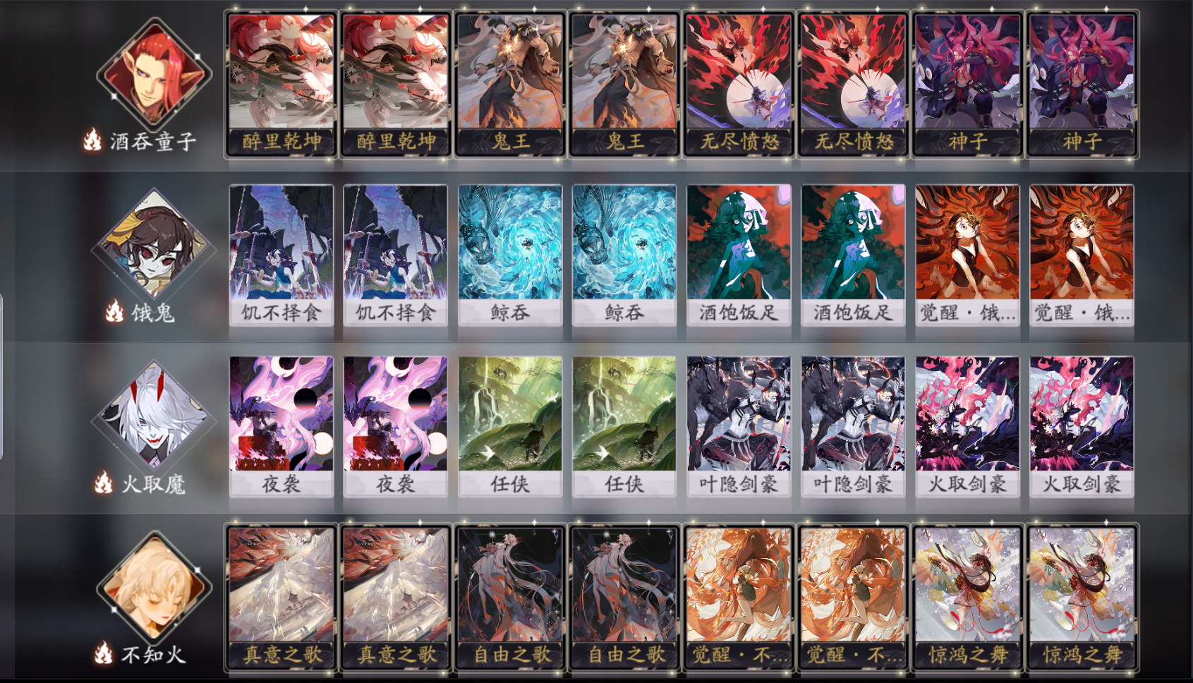 卡组构成分为一主c火取魔一副c酒吞两辅助不知火和恶鬼,核心卡为火取魔的ssr卡火取剑豪。