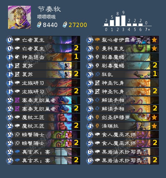 当下的猎人有T7猎和中速猎之别,二者构筑其实都差不多,只不过T7猎直伤更多,中速猎场面更扎实,起手找螃蟹骑士,无论是配合神圣化身还是真言术:宴都有特别不错的发挥,值得注意的是面对1费的新生刺头,神圣惩击是交了保血量还是留给可能的科卡尔驯犬者还有待商榷,再者就是猎人5费狂踏的犀牛要留有手段处理。剩下的就是神圣化身搭配突袭怪的回血加返场或是各种1费奶的抬高血量了,这个对局我们的致胜目的明确且没啥变数,算是优势比较大的对局。