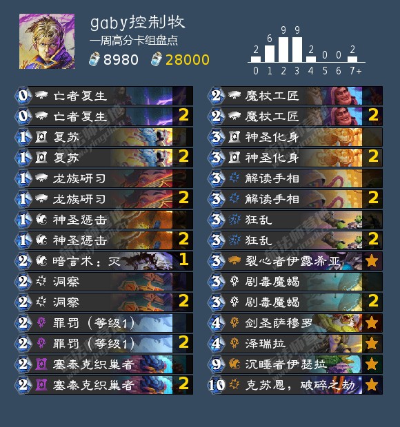 之一:与一周高分卡组盘点20210420中的常规控制牧相比,这套构筑的亮点在于舍弃了后期资源单卡沉睡者伊瑟拉和各类小AOE,带上了螃蟹骑士与真言术:宴作为前期控场手段,并满编了黑岩法术抄写员作为资源补充和针对法术系卡组的食人魔巫术师。在我使用这套卡组上分的途中,没有遇到相同构筑的牧师,大部分都是有无克苏恩的区别,所以构筑上这套卡组绝对称得上是新奇的。