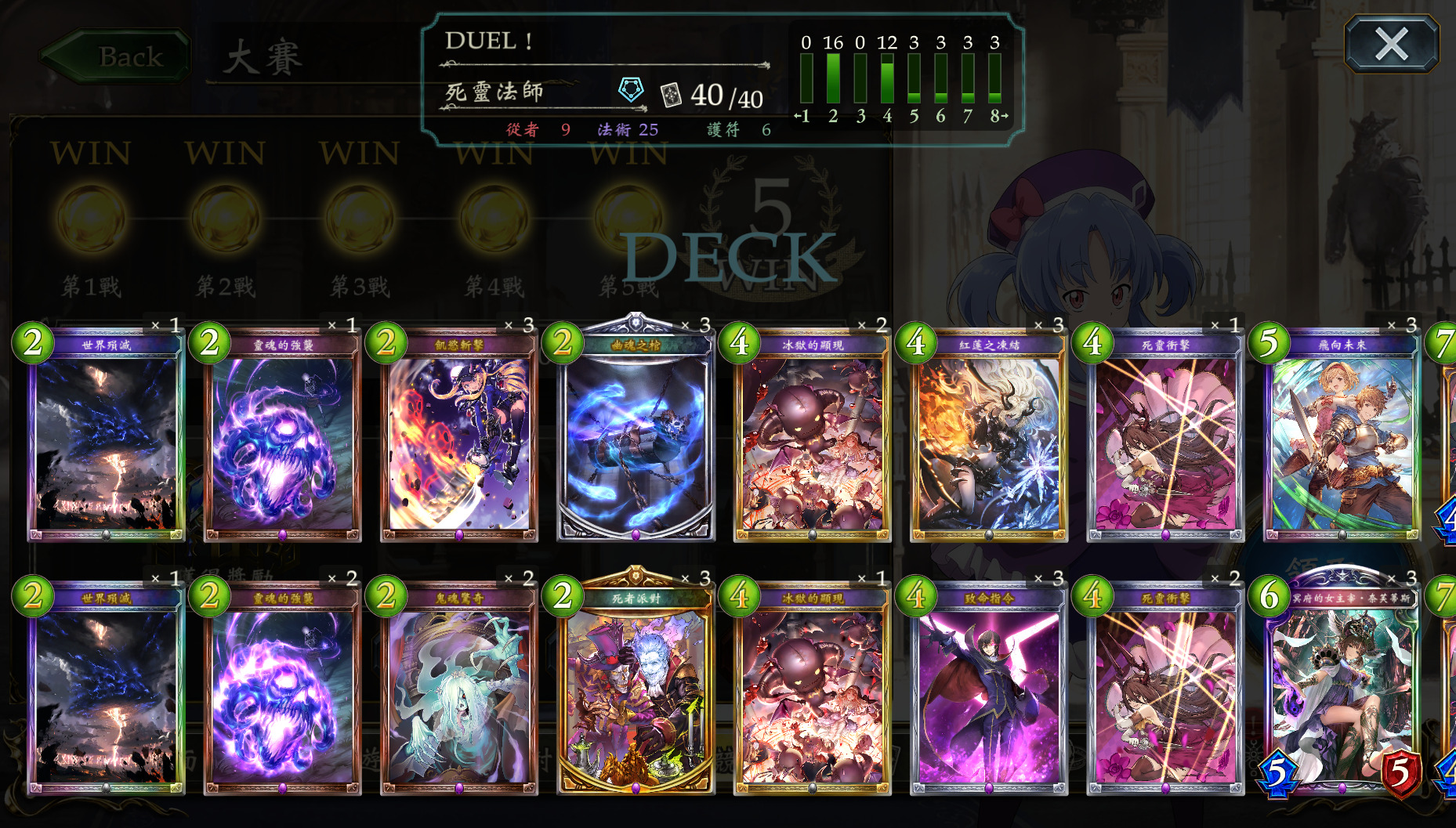由于无法投入第4种随从,决斗死需要大量的法术或护符来度过前期。饥欲斩击和幽魂之棺可以在葬送巴萨拉加或巨星的同时过牌,使决斗死有机会在第4~5回合便通过指令在场上留下巴萨拉加。另外,在葬送过巴萨拉加的情况下,决斗死便可以随意激奏巨星争夺场面并堆墓,而不必担心洗入牌堆的9费巨星影响奈芙蒂斯检索。