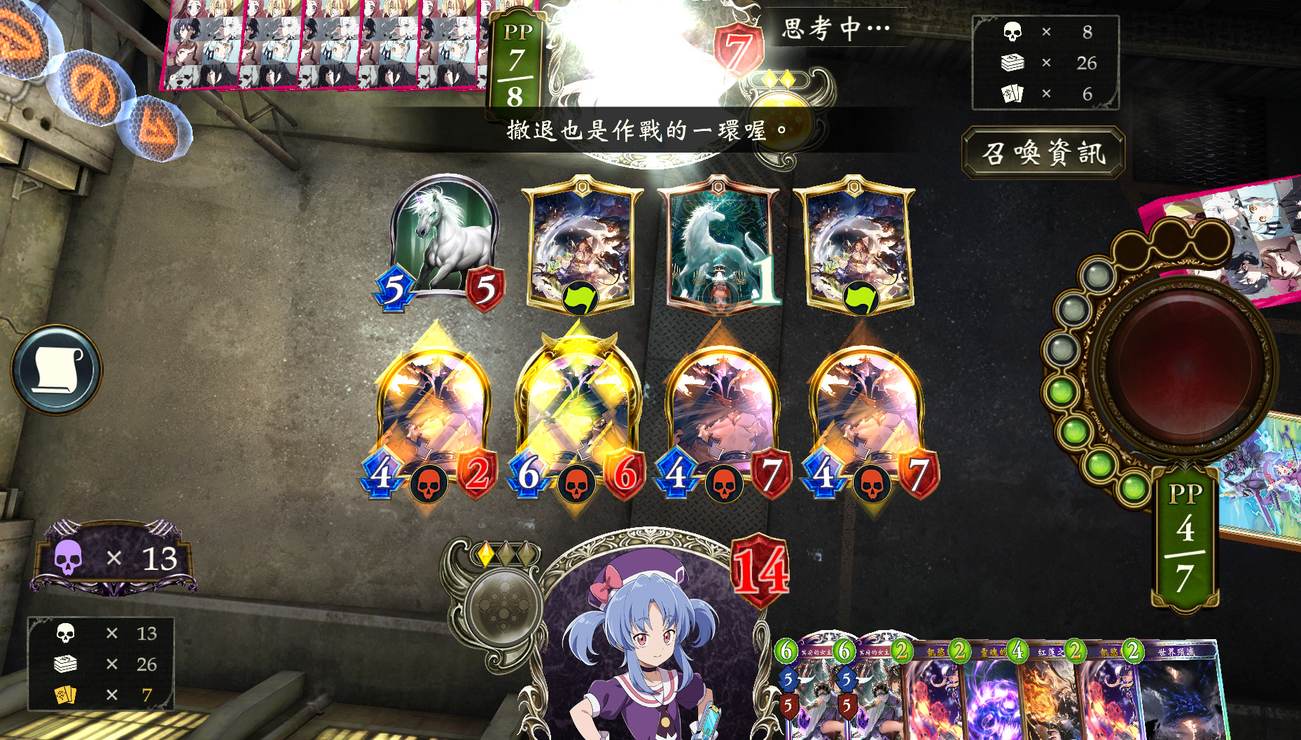 第5回合以前积极解场。预测对手的可能动作,保留相应的解牌。