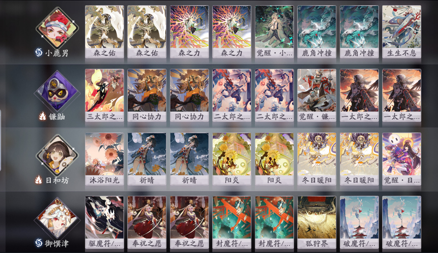 小太阳:满编祈晴,冬日暖阳和阳炎,阳炎主要起二勾干扰作用,会让对方准备升的式神两回合无法行动,对阵后期卡组且自己首先三勾又无法斩杀对手的情况下可以剩1火触发阳炎,这样可以大幅度延缓对面的节奏,尤其是可以针对百目鬼三勾挂诅咒之眼。觉醒日和坊可以替换成沐浴阳光,有的话可以提高后期强度,没有的话换成沐浴阳光也没有太大的问题。