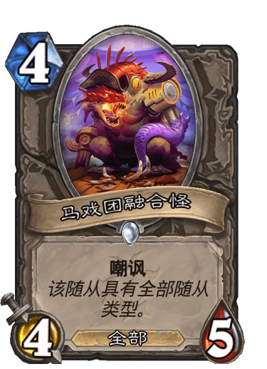 很多人会很惊讶我为什么会带这张看起来和整个卡组毫不相关的牌?首先是这张牌打一的aoe,可以在中期帮我们控一下场面,如果你提起了敲狼锤就可以处理现在环境里一些四血生物(比如中立的曼科里克,猎人的战歌驯兽师等)这张卡太冷门了,可以打对手一个措手不及(没想到吧)这里还要提到一下和猎人的这个对局。我们的两个四费生物(马戏团融合怪和大地亡魂)都是高血量嘲讽生物,猎人会想用狂踏的犀牛打出更高的贯穿伤害,而这两张高血量嘲讽可以保护住我们的小生物,让猎人没那么舒服的打出伤害。