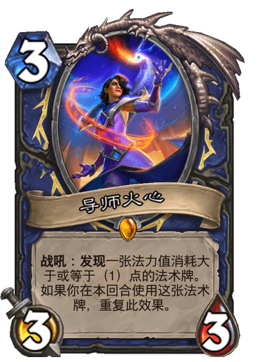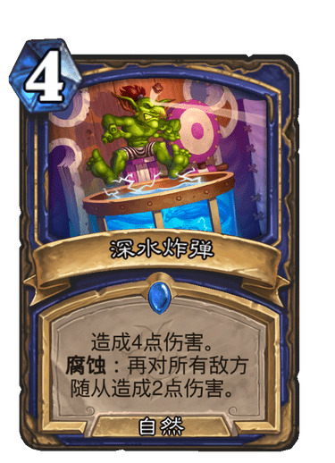 整个外挂组件中最重要的一张卡。你可以将她理解成和魔杖工匠类似的作用,提供卡组外的一些资源,我常常会用这张牌在游戏的中后期找直伤斩杀对手,但其实很多时候如果你中期优势很大,这张卡也有一锤定音的效果。和魔杖工匠一样,有时候也会用她找低费法术破骑士的奥秘然后用深水炸弹解场。